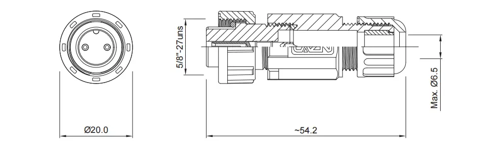 | Prise femelle droite installable sur site E10 (filetée) | 60V | 5A | 7 | E10T-S7-PWA06 | ↓ | ↓ |