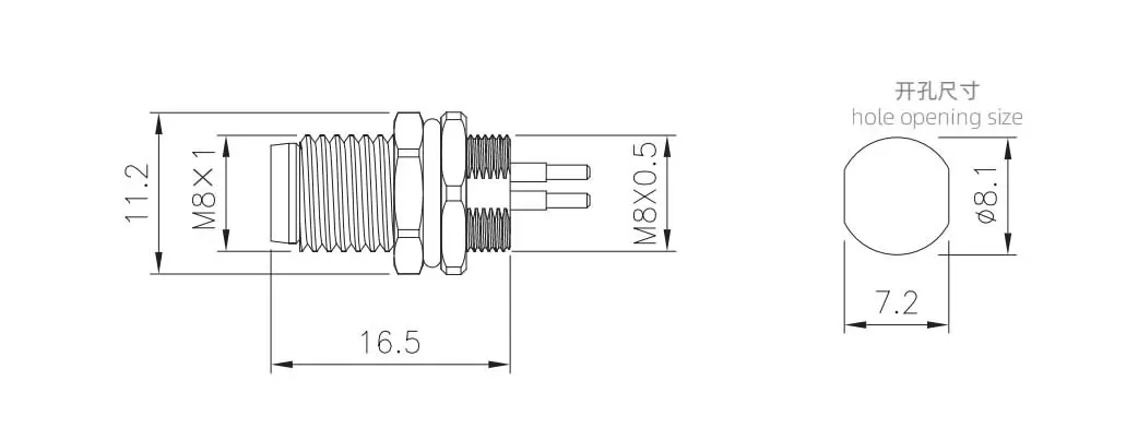 | Prise mâle M8 à montage frontal, broche 4A | M8x0,5 | PCB | 4A | M8-P4A-GPB M8 | ||