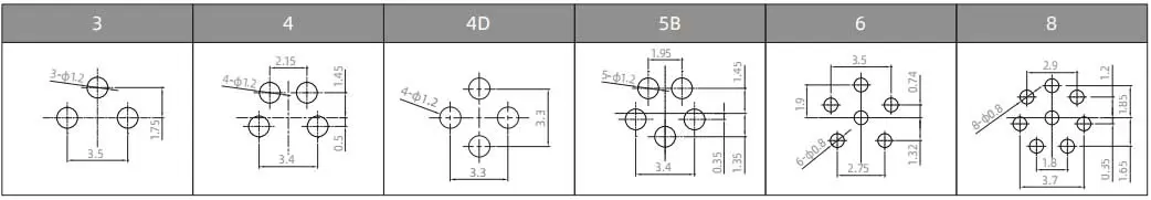 | Prise mâle M8 à montage frontal, broche 6A | M8x0,5 | PCB | 6A | M8-P6A-GPB M8 | ||
