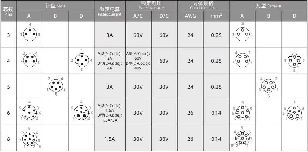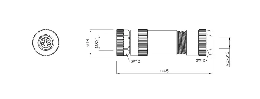 Connecteurs standards européens Série M8 Type de structure : Fiche droite assemblée en métal Type de broche : Type femelle Nombre de contacts : 3, 4 broches, Méthode de connexion : Vis Blindage : Oui Certification : CE, RoHS, UL, Norme : CEI 61076-2-104
